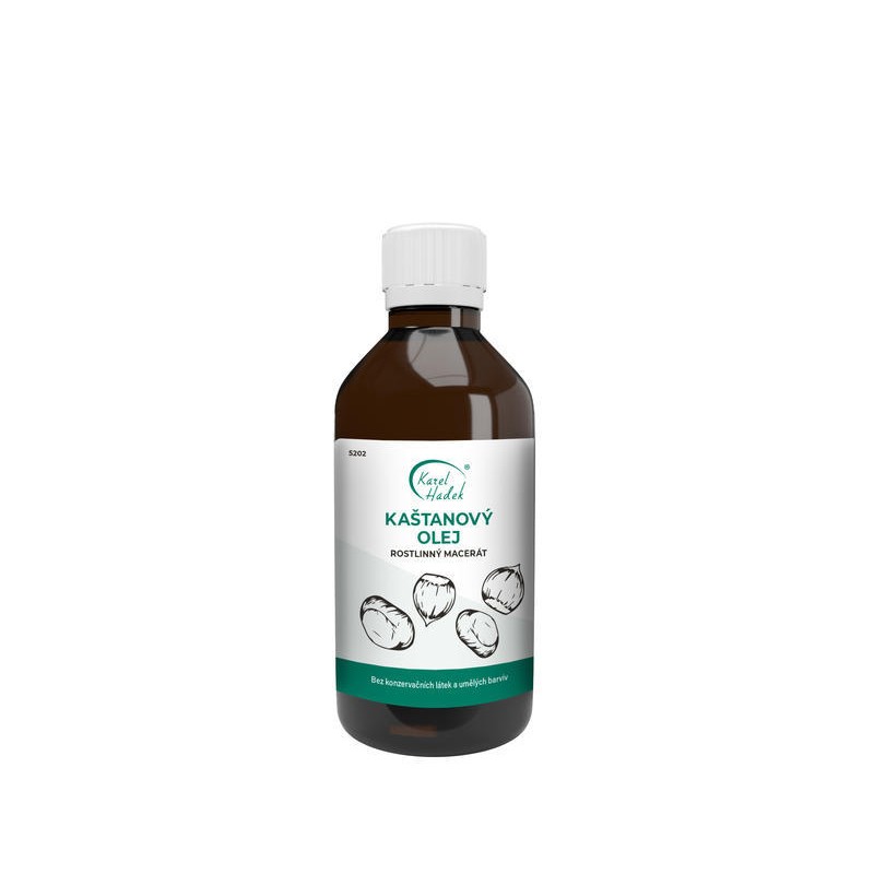 Kdo by neznal kaštany, plody statného stromu jménem jírovec maďal neboli kaštan koňský. Méně jsou však známé účinky tohoto plodu na náš organismus. Pro aplikaci se výborně hodí forma olejového macerátu. V našem případě byl pro svou stabilitu zvolen sójový olej. Olejový macerát je výluh rostliny v oleji, do kterého z ní přechází účinné, v olejích rozpustné látky. V aromaterapii jsou maceráty jedinečnou a neodmyslitelnou součástí masážních a regeneračních olejů, krémů, balzámů a mastí.